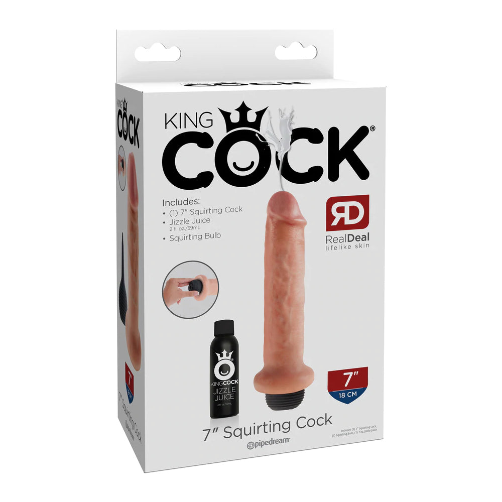 This King Cock Squirter is ultra-realistic and will satisfy all your cravings for cum-play! Hand-sculpted with amazing attention to detail and featuring our exclusive Jizzle Juice squeeze-bulb, the King Cock Squirters are the most satisfying ejaculating dildos on the market! Every King Cock Squirter is phthalate-free, latex-free, body-safe, hypoallergenic, and proudly made in the USA.
