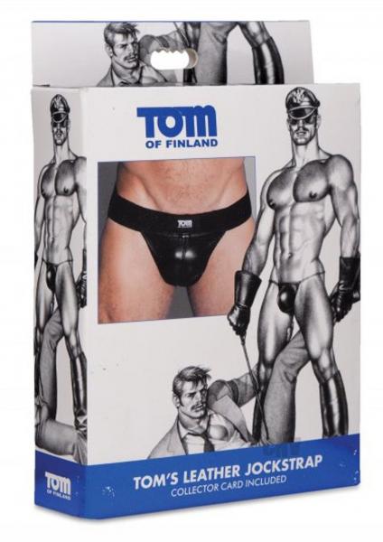 Wrap your package in gleaming black leather and look like a true Tom of Finland stud with this stretchy and hot leather jock strap! The elastic waistband bears the Tom of Finland logo, with gleaming leather making up the molded pouch, hugging your bulge and making your cock look just like a piece of art. Each of the two back straps run under your ass, leaving your hole open, exposed, and ready for action. Two sizes available, both stretchy and designed to fit a range of body sizes and shapes. Measurements fits waist size 34 inches to 38 inches. Materials Leather, elastic. Color Black.