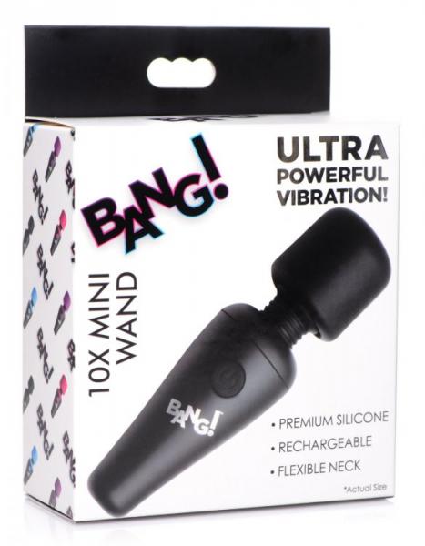 Bang! 10X Vibrating Mini Wand Black from XR Brands. The perfect travel companion! This tiny wand fits in the palm of your hand but delivers a powerful punch! Wherever you go, slip it into a travel bag, a purse, a large pocket, or tuck it away in your drawer at home! Now you can enjoy your favorite wand vibe without taking up as much space! This premium Silicone vibrating wand has a flexible neck for pressing the vibrating head into any area that feels pleasurable to relieve your tension at any time. Choose between 3 speeds and 7 patterns of vibration until you find the perfect setting. After use, simply wash with warm water and soap, and spray with a toy cleaner. Use only with a water based lubricant. Measurements: overall length 4.3 inches, Head diameter 1.2 inches. Materials: Silicone head, ABS plastic handle. Color Black. Key features: travel friendly wand: This mini wand can fit in the palm of your hand making discreet travel with your favorite vibe easy! Flexible neck the neck bends enough so that the vibrating head and be pressed or moved into the angle that feels best for you. Powerful vibration: choose between 3 speeds and 7 patterns of vibration. Rechargeable vibrations and body safe: made of premium grade Silicone, this toy is USB rechargeable. Simply insert the jackpin into the dimple at the base of the charger and connect to a USB port. Video.