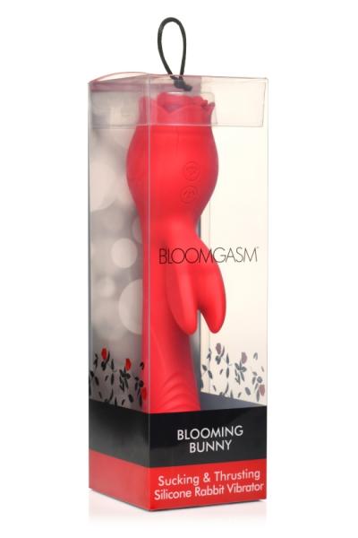 Bloomgasm Blooming Bunn Sucking and Thrusting Rabbit Vibrator from XR Brands. This Rose is the complete package when it comes to female satisfaction! The stem of the Rose is a slightly curved, flexible shaft with a round head and ribbing beneath the head. The Rabbit ears vibrate and rest against your clit as you enjoy the auto thrusting feature! There are 3 speeds of thrusting to enjoy that also turn on the vibration, too! Switch it around and use the rosebud and its powerful little suction hole to suck your Clit with 10 different intensities to choose from! These can be operated simultaneously or at the same time if your femme partner wants to join on one side! You can even take it in the shower, too! It is rated IPX6 waterproof so it can handle powerful jets, but should not be submerged underwater. Made out of premium quality, silky smooth Silicone, it is also body safe and phthalate free. Use only with water based lubricants for best results. To clean, wash with warm water and mild soap and then spray with a sex toy cleaner before patting dry. Recharge using the USB cable provided. Grab your water based lube and then use it liberally over your clit and the shaft and Rosebud. You can use the suctions on your nipples to warm them up, or buzz them against your breasts. Slide your hands between your thighs, making sure there is enough lube, and slip the shaft inside. Let the thrusting begin and allow yourself to get comfortable as you open up! The Rabbit ears tease your clit as the shaft thrusts inside you, rubbing against your G-spot. Switch it up and use the clit sucking Rose on your sensitive pearl until you're nearing your peak of pleasure! Then switch to the thrusting shaft again and ride the waves of ecstasy! Use it alone or with a partner to spice things up!
