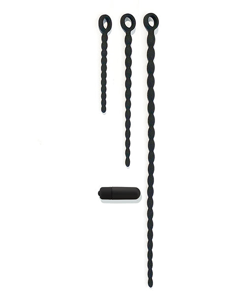 Silicone urethra trainer kit with interchangeable 7-speed vibrating bullet. 3 ribbed super flexible dilators with different length and diameter (9, 10 and 12 mm), great for intense urethral and prostate stimulation, for beginners as well as advanced users.