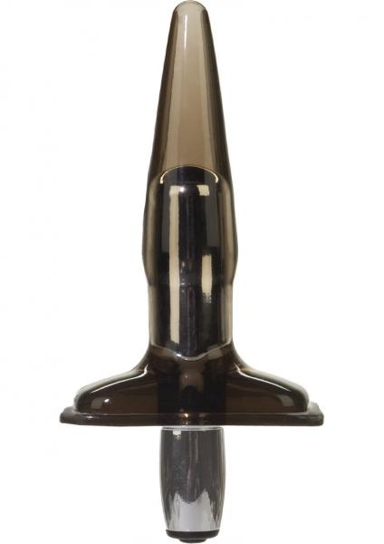 High Intensity Vibro Tease Smoke. Powerful vibrations that resonate throughout. Slender probe with removable, high-intensity, quiet, push button stimulator. Extended easy grip base. Safe and pure for body and pleasure. Made using phthalate free, non-toxic materials: Thermoplastic Elastomers TPE probe, ABS plastic with silver plating stimulator. Anal prone measures 3.75 inches long by 1 inch wide. Vibrating sex toy requires 1 AAA battery, not included. Do not leave battery in the vibrator between uses. Always clean before and after use.
