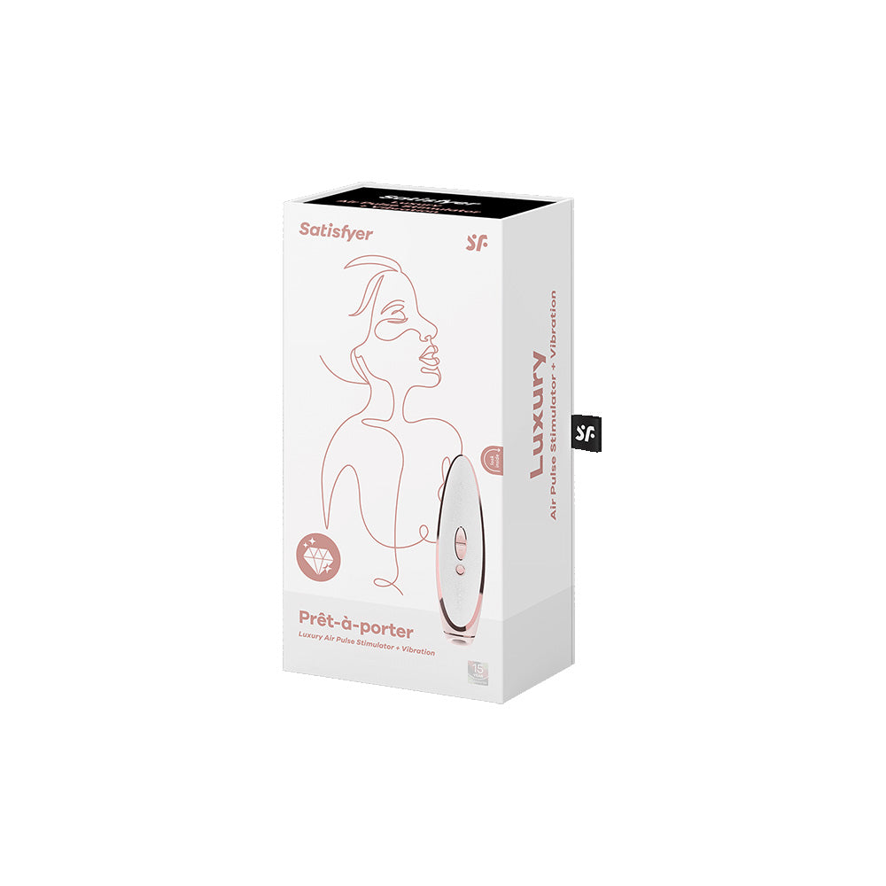 The Satisfyer Pret-a-porter impresses with its glamorous and elegant design. Equipped with a body made of silky-matt silicone, an upper part made of textured real leather and noble, rose gold-colored metal details, it’s not optically attractive – due to its ergonomic shape and the sensual haptics it nestles perfectly into your hand, delighting your clitoris with breathtaking Satisfyer pressure wave stimulation.