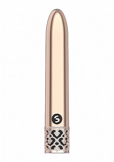 Royal Gems Shiny Rose ABS Plastic Bullet Vibrator Rechargeable from Shots Toys. You do not need to be royalty to enjoy this elegant line. The sleek metal finish makes this vibrator the crown jewel of any collection. Shiny is slim and long, great for internal or external stimulation. The magnetic fully rechargeable proprietary New Generation F-1 motor design delivers mind blowing vibrations uniformly across the full surface of the toy. Dont settle for the common, choose to be royal. Dimensions package 6.5 inches by 3.94 inches by 1.34 inches. Weight package 0.4 ounce. Product dimensions 4.25 inches. Product diameter 0.71 inch. Quantity motors 1. Rotations vibration tip 10,000 RPM. Speed modes 10. Multi speed vibrations. Noise level 45 dB. Rechargeable vibrations. Rechargeable time 120 minutes. Recharged battery life time 60 minutes. Waterproof vibrations. Splashproof for play in the shower. Phthalate free, body safe materialsABS Plastic.