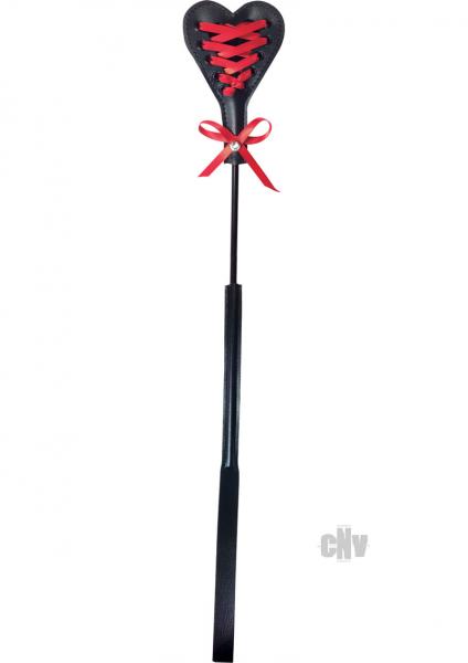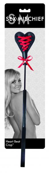 Sex and Mischief Heart Beat Crop. Create unique sensations with our new Heart Beat Crop. One side is smooth for spanking, stroking, and caressing. The other side features a plush red lace fabric tied up like a corset harness and is adorned with a blinged bow. The bling adds to the sting! Use this beautiful new addition to your collection to invent your own Sex & Mischief fantasy. Includes 1 Heart Beat Crop. Materials: Polyurethane PU Fabric, ABS Plastic, Polyester, Nickel Free Metal Hardware, Vinyl, Cubic Zirconia
