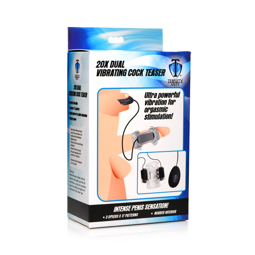 Give yourself a genuine cock tease with this Dual Cock Teaser! The stretchy, TPE sleeve has a nubbed interior that reacts to the powerful bullet vibes to tease and tantalize your shaft! The dual vibrating bullets slip into parallel pockets on either side of the sleeve. With a snug, tight fit, the bullets give an even vibration that spreads through the shaft, head and even down to the balls! Enjoy controlling the powerful vibration from the corded remote. Choose between 3 speeds and a whopping 17 patterns to enjoy! Try something new every time when you combine the vibration speed and patterns. Enjoy the sleeve during masturbation, foreplay or simply to tease yourself until you've been edged and milked!